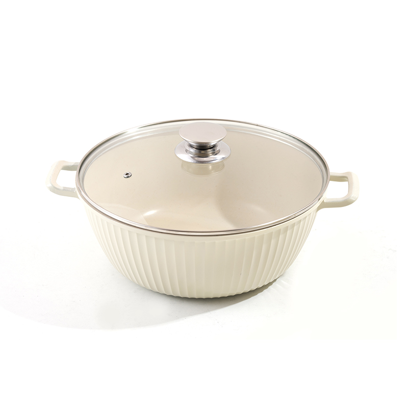 Ribbed body with matching handles, granite non-stick interior, multi-size stockpot set, easy to clean, durable, compatible with all stovetops, creating a minimalist Nordic kitchen.