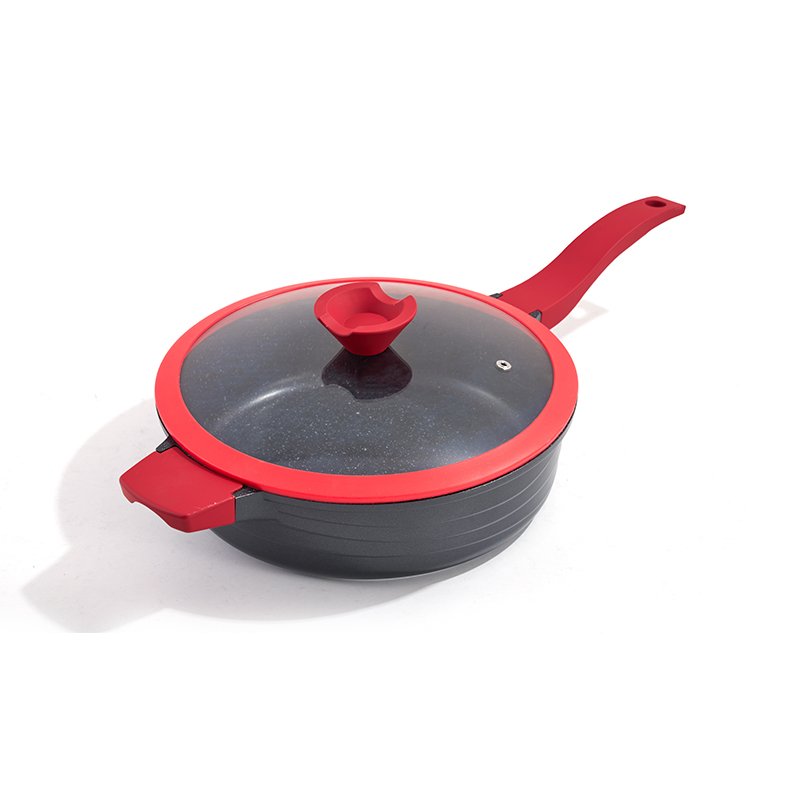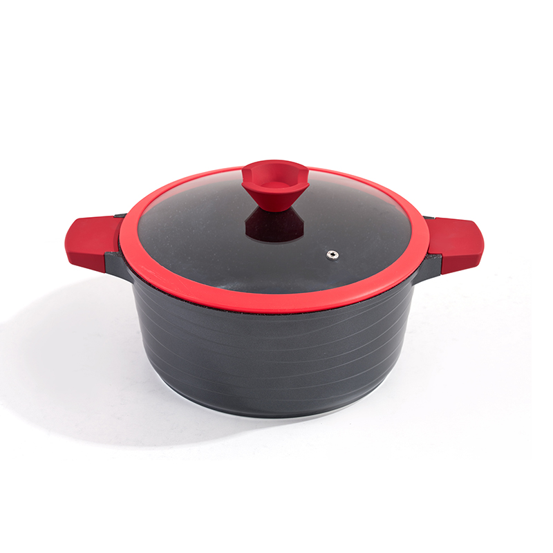 Black-red contrast body with heart-shaped knobs, non-stick granite interior, multi-size set for frying and stewing, easy to clean and durable, compatible with all stovetops, stylish texture.
