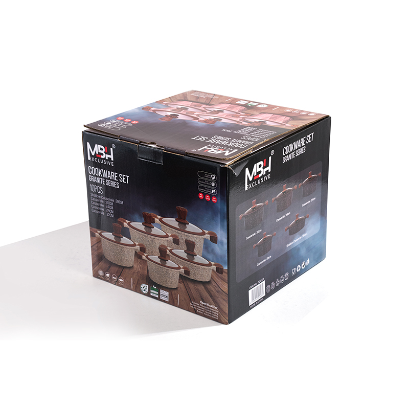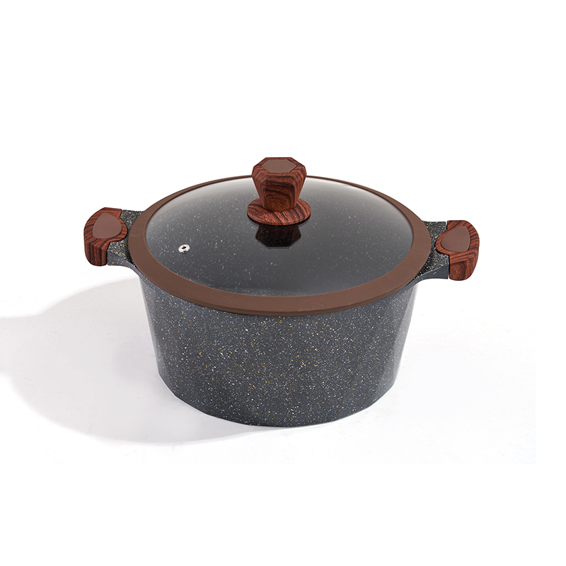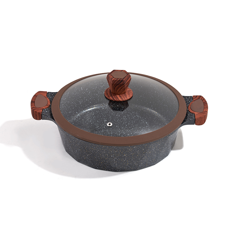 Classic round body with sturdy wood grain handles, granite non-stick coating, even heat distribution, versatile for simmering, frying, and boiling, easy to clean, durable, classic kitchen essential.