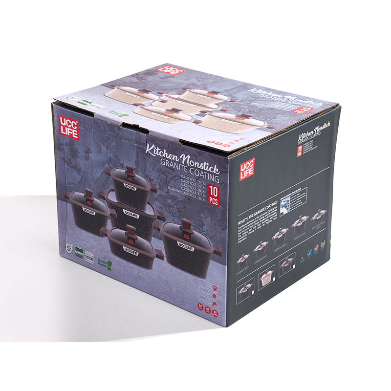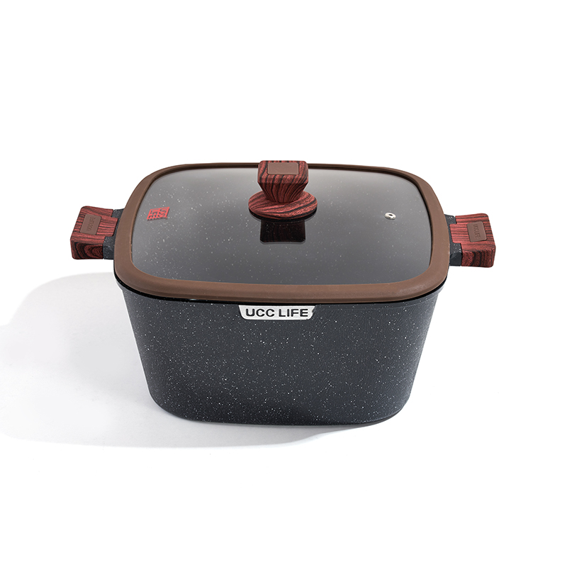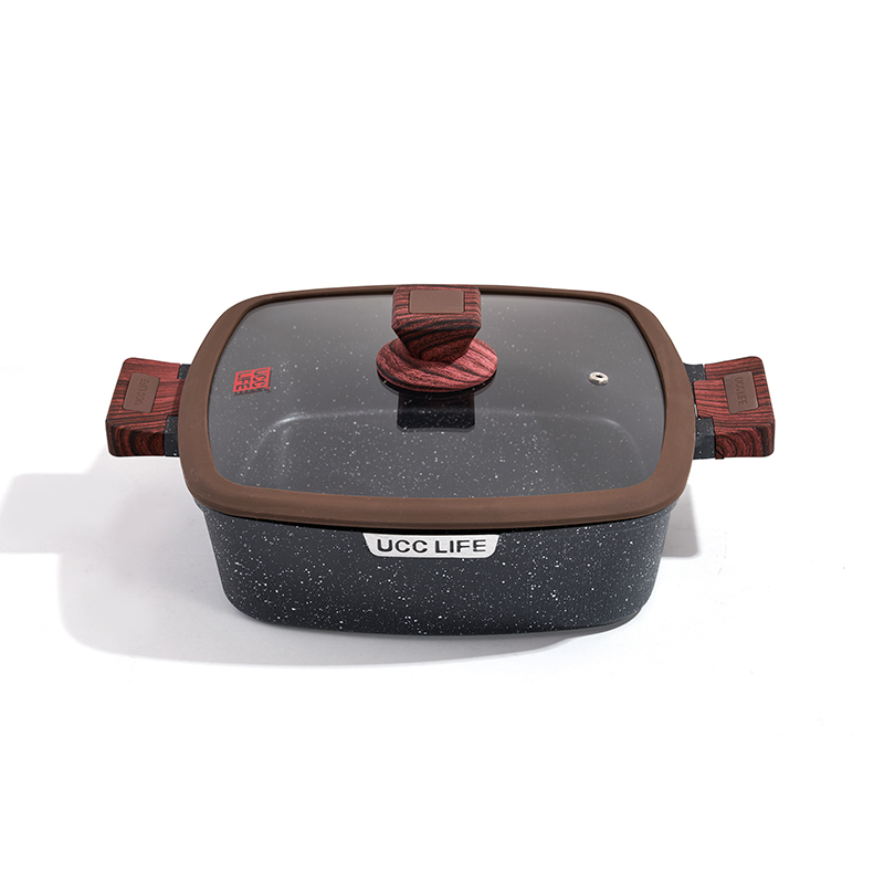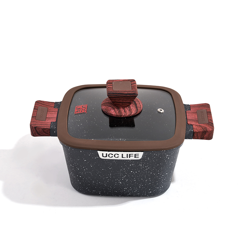 This square cookware set features granite non-stick material, space-saving square shape, heat-resistant wood grain handles, lids with silicone-wrapped edges for good sealing, working on all stoves and suitable for frying, stewing and braising.
