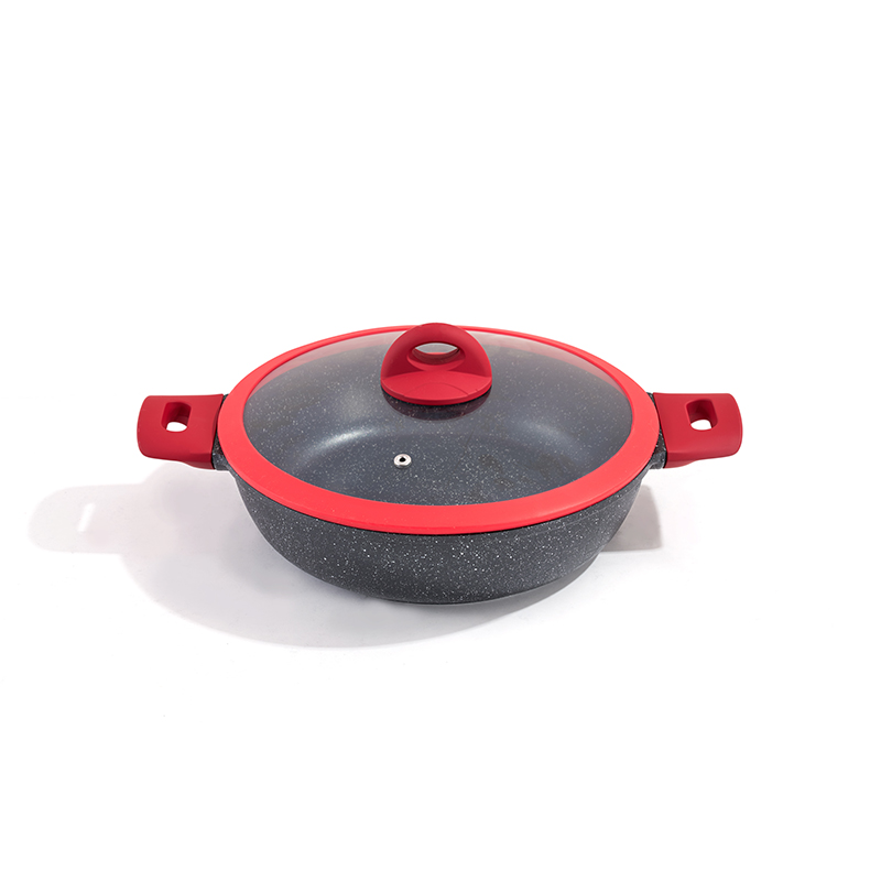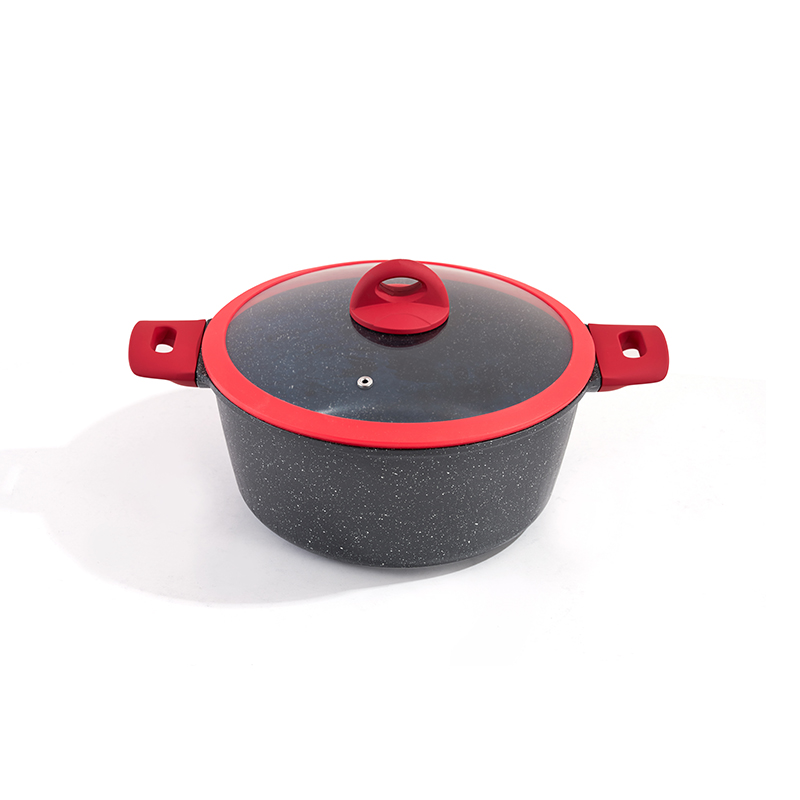 Black-red contrast body with red silicone trim, non-stick granite interior, multi-size set for frying and stewing, easy to clean and durable, compatible with all stovetops, stylish and practical.
