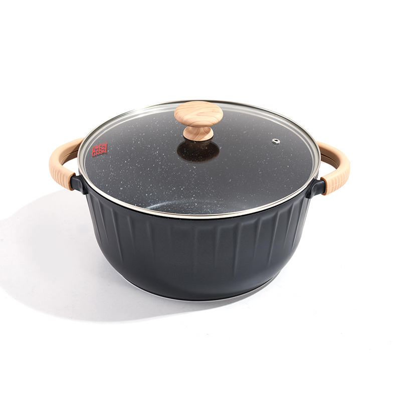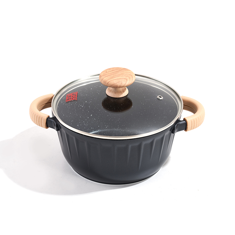 This set features vertical fluting: deep pots for stewing, shallow pans for frying, small pots for heating. Silicone-wrapped beech handles offer heat and slip resistance, with fluted design for strength, fitting all stovetops.