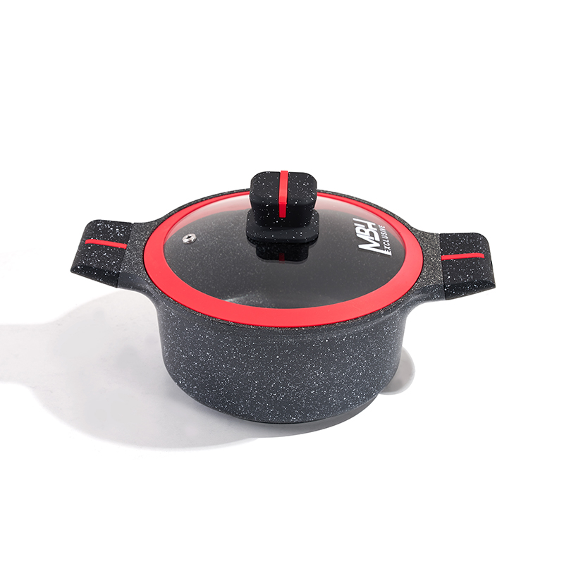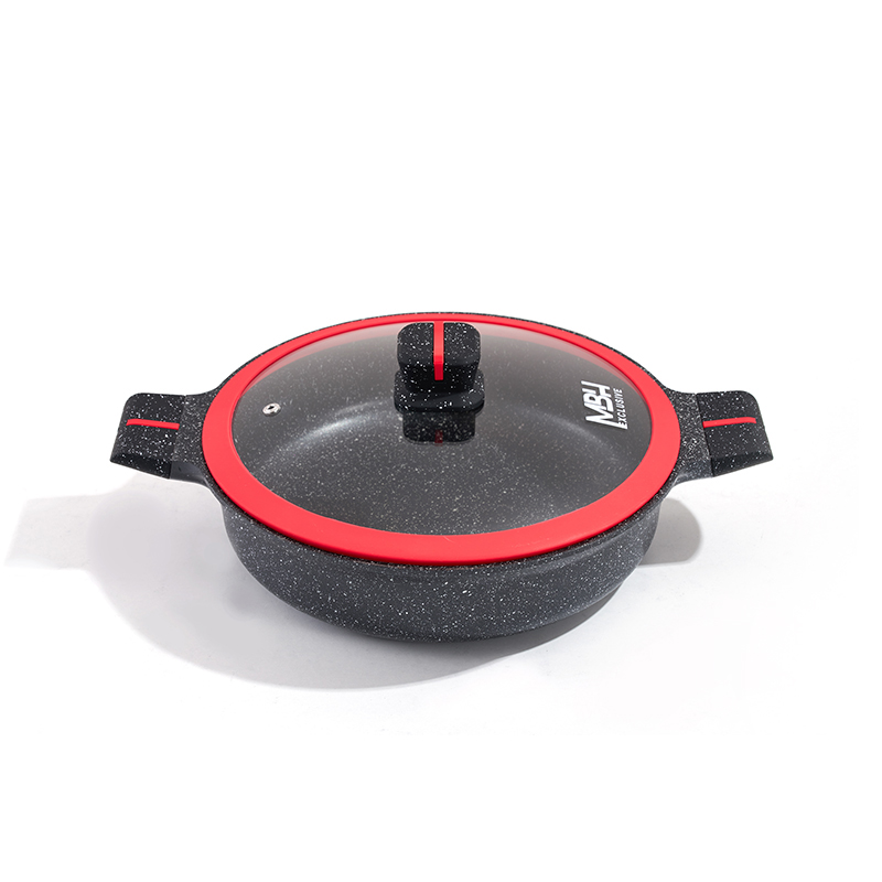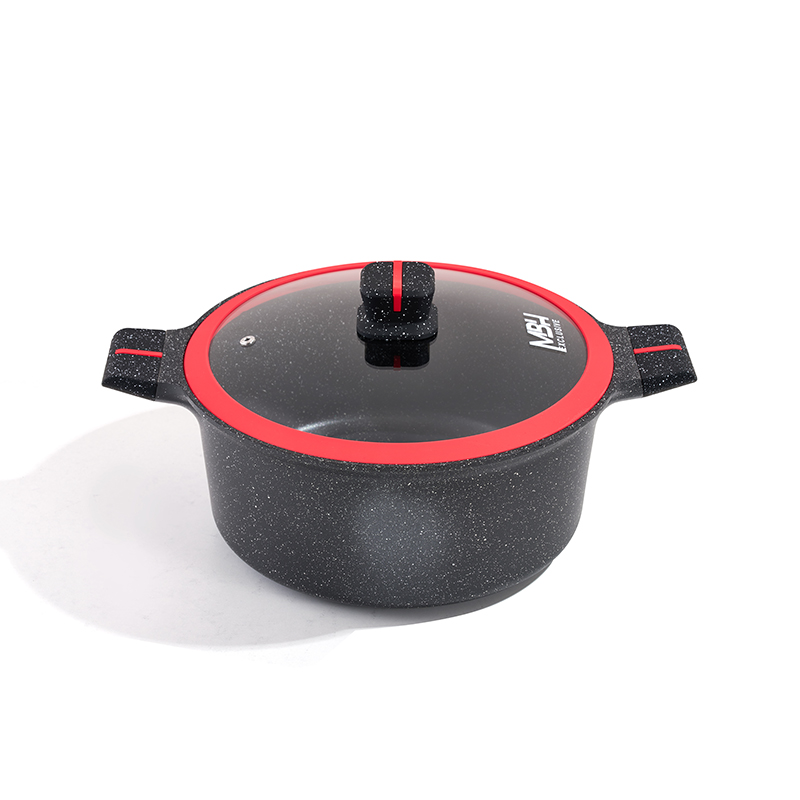 Sleek black granite-textured body with red contrast trim, detachable silicone lid ring, multi-size set, ideal for frying, stewing and braising, non-stick, easy to clean, induction-compatible.