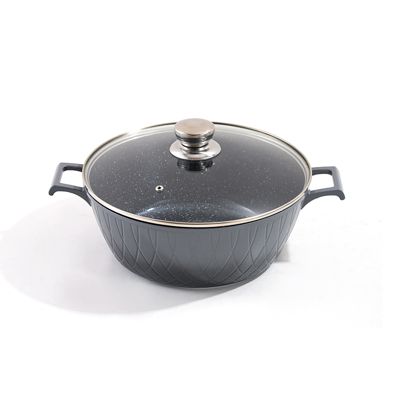 Slate grey embossed body, granite-speckled interior, matching metallic handles, multi-size stockpot set, easy to clean, durable, compatible with all stovetops, low-key luxury for a textured kitchen.