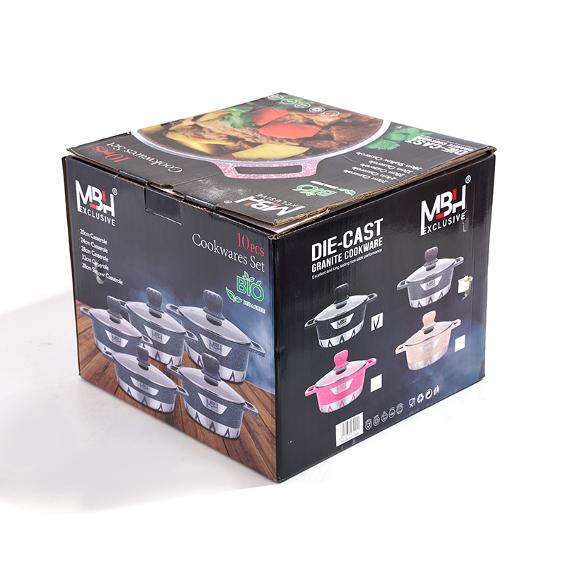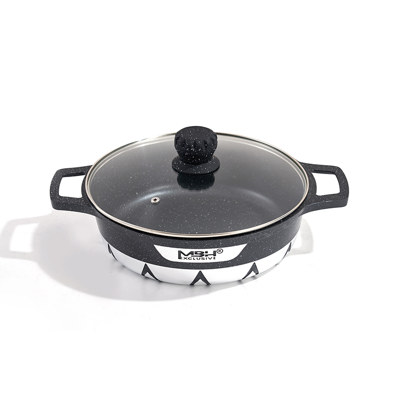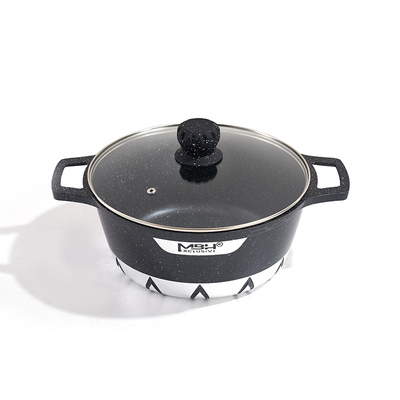Black granite-textured body with sun-patterned heat-conductive base, stackable for space saving, multi-sizes for stewing and braising, non-stick and easy to clean, compatible with all stovetops.