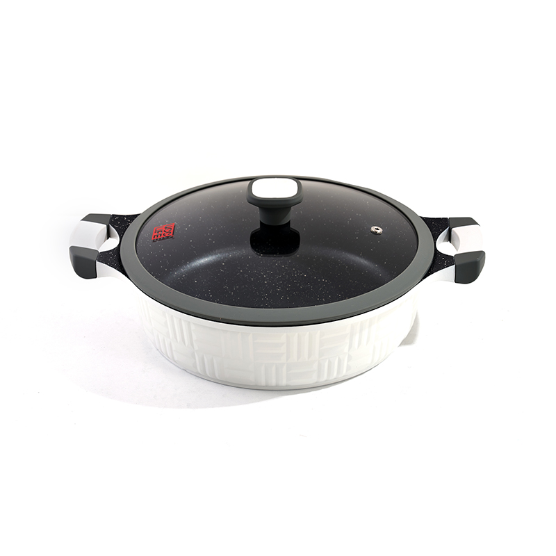 A die-cast aluminum cookware set is made by injecting molten aluminum into a steel mold under high pressure. The result is a single-piece body with no rivets, no seams, and noticeably thicker walls than stamped aluminum. This process creates pans that feel almost as heavy as cast iron but heat up nearly as fast as standard aluminum.