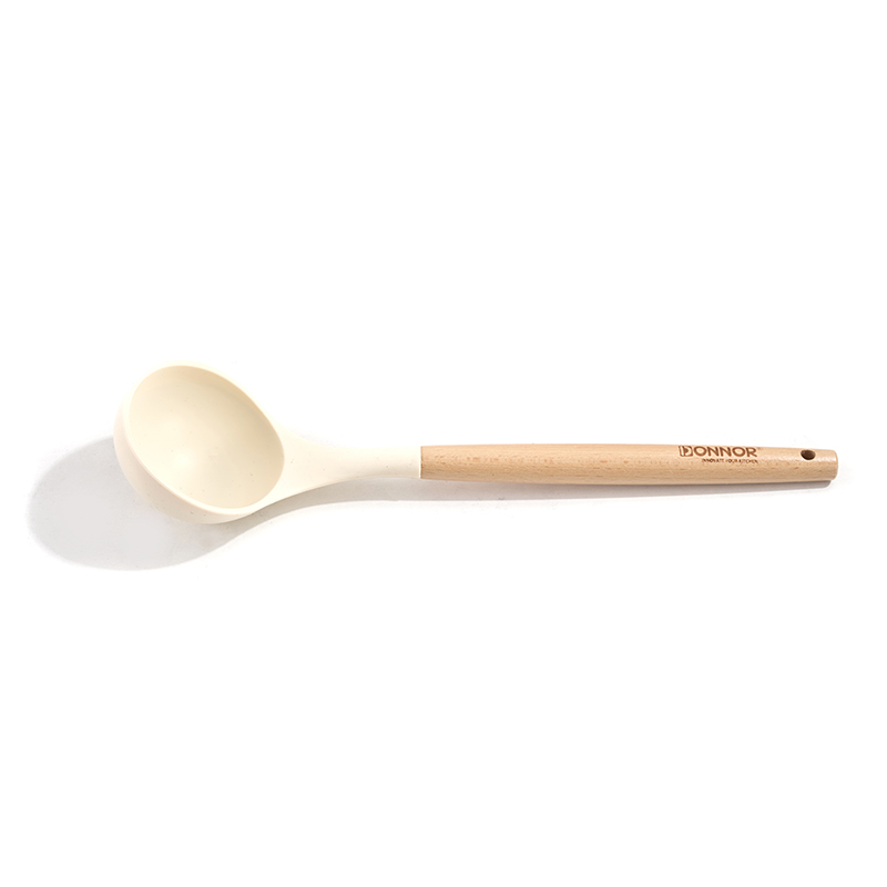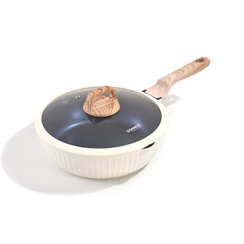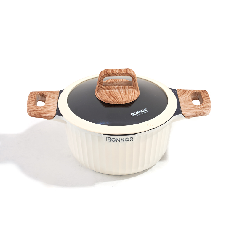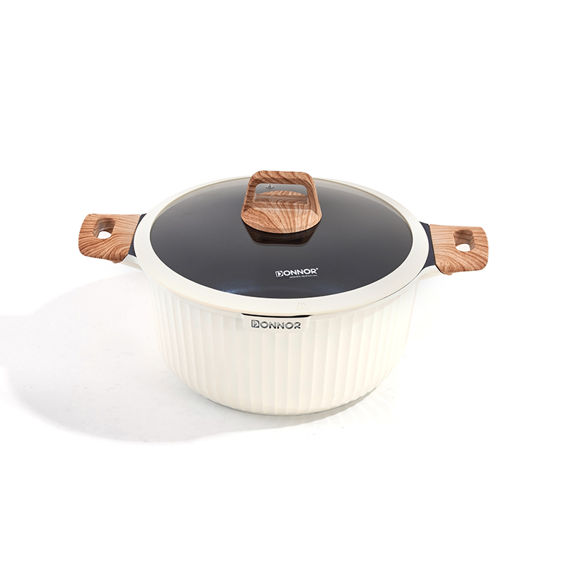 Ridged body with wooden heat-resistant handles, complete with silicone utensils and cleaning tools, stackable for space saving, food-grade non-stick coating, compatible with all stovetops, fresh Nordic style.