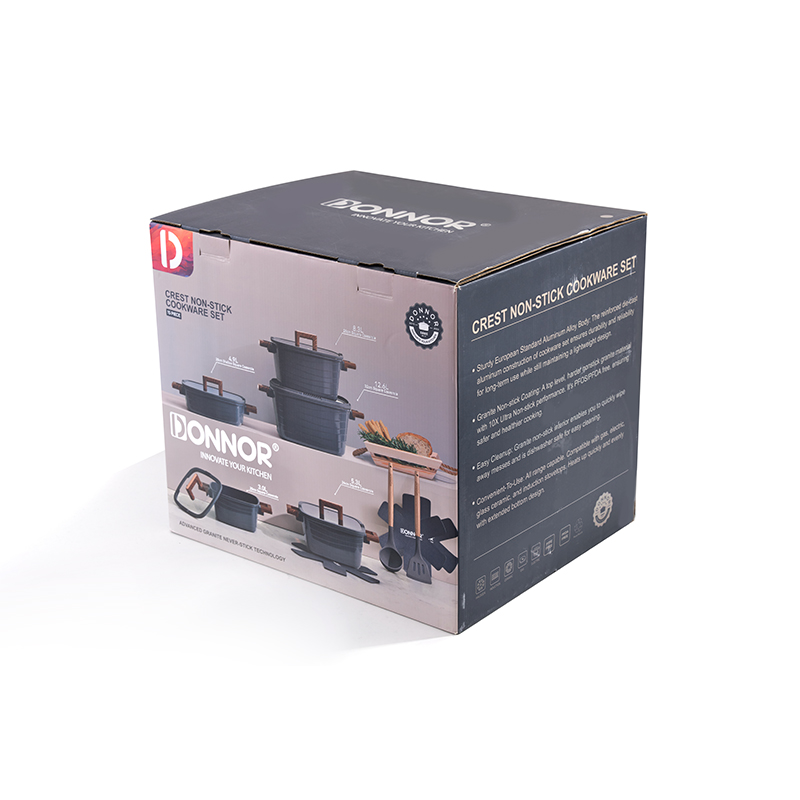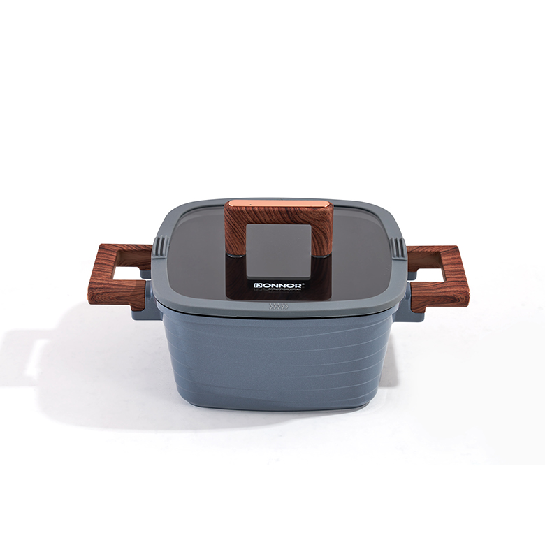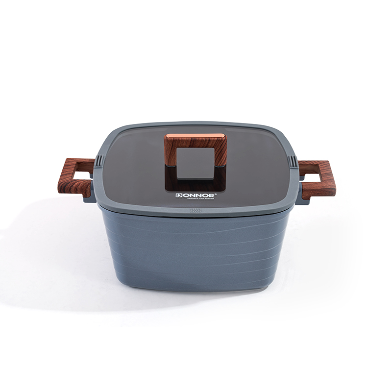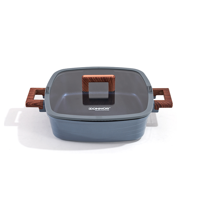 Square ribbed body with wooden heat-resistant handles, complete with silicone trivets and wooden-handled utensils, stackable for space saving, food-grade non-stick coating, compatible with all stovetops, modern and durable.