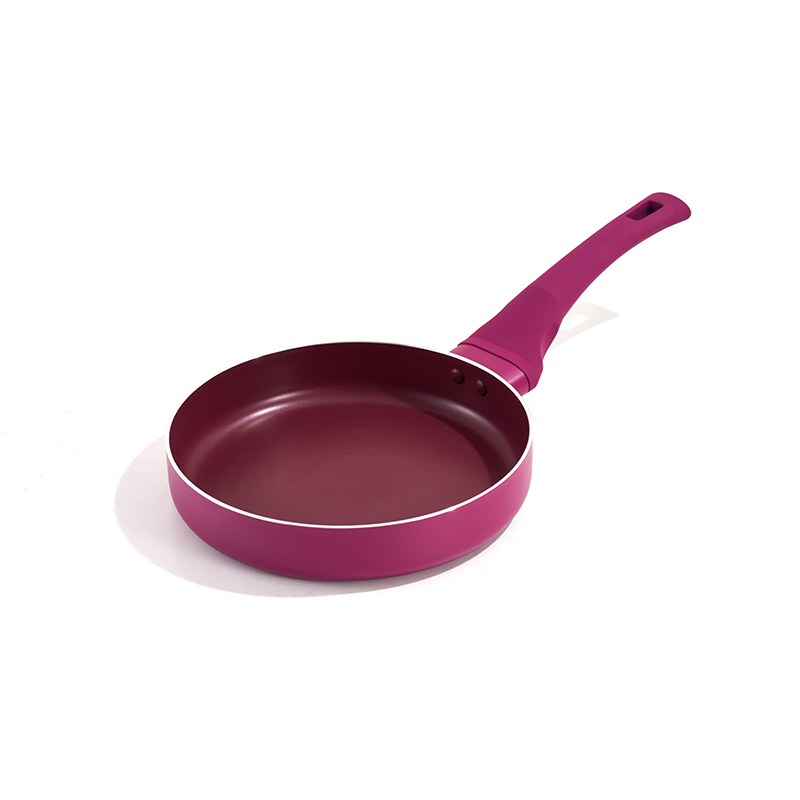 Plum red matte body with white trim, matching sleek handles, multi-sizes for frying and stewing, non-stick and easy to clean, modern minimalist style, compatible with all stovetops.