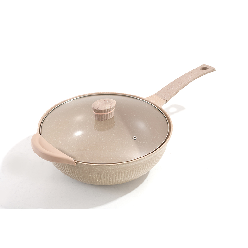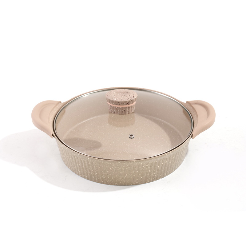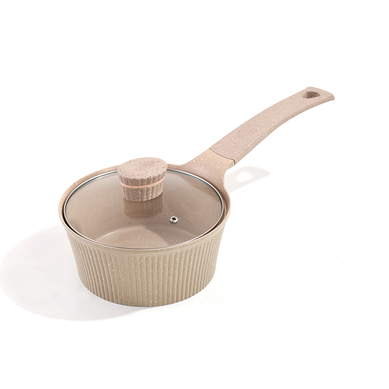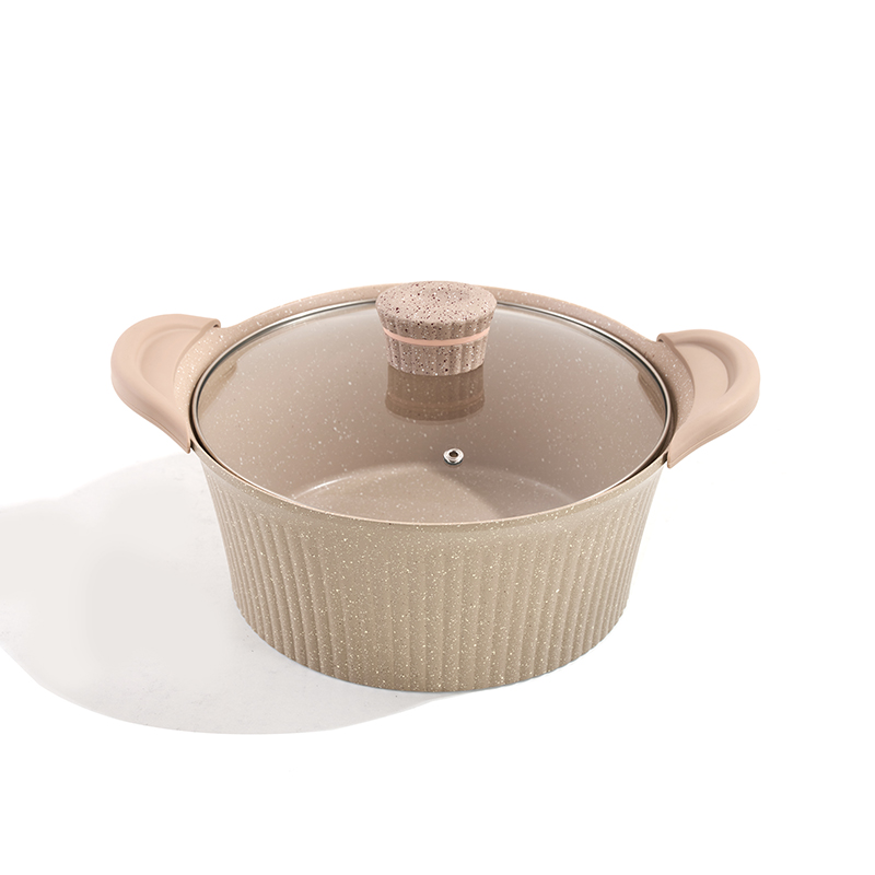 Light beige ribbed body with non-stick granite coating, clear glass lids, ergonomic handles, multi-sizes for frying and stewing, easy to clean and store.