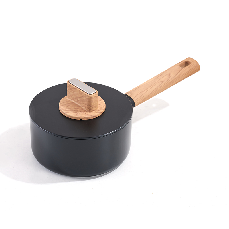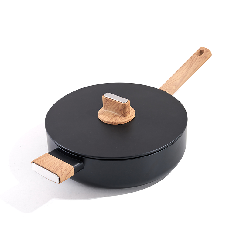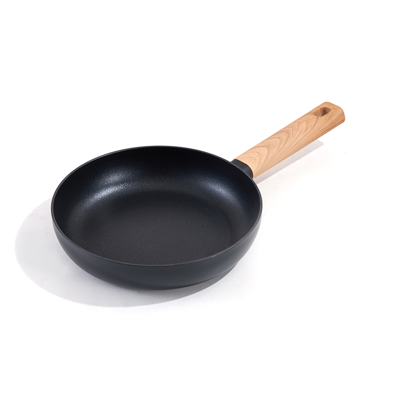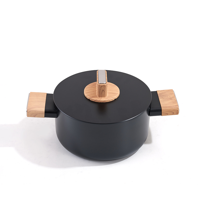 Matte black body with natural wood-grain handles, seamless die-casting for easy cleaning; ergonomic heat-insulating grips, stackable storage, compatible with all stovetops, ideal for frying, boiling and stewing.